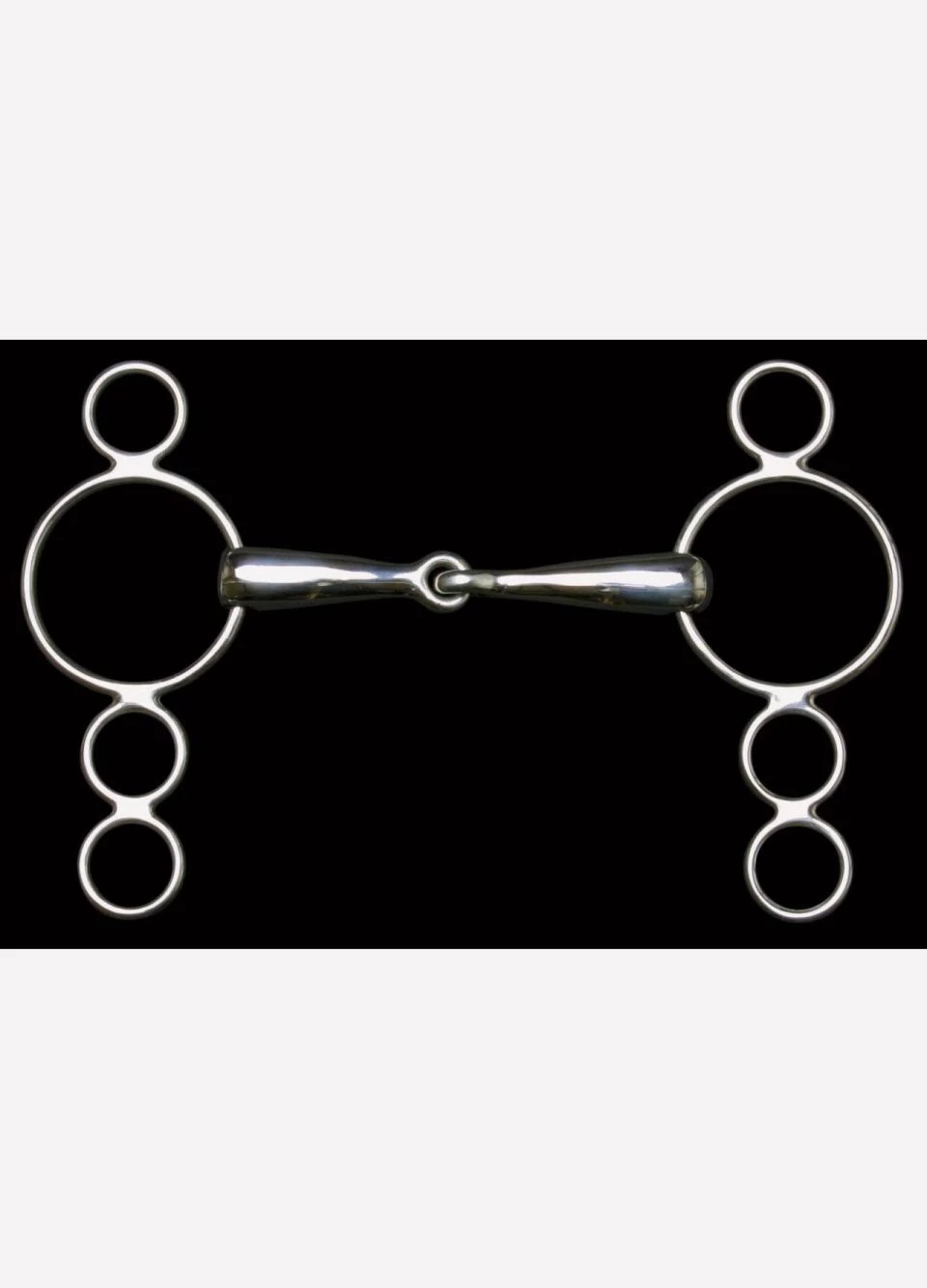 Stainless steel, dutch gag. The different rings give varying levels of leverage. A very popular bit because of this flexibility.