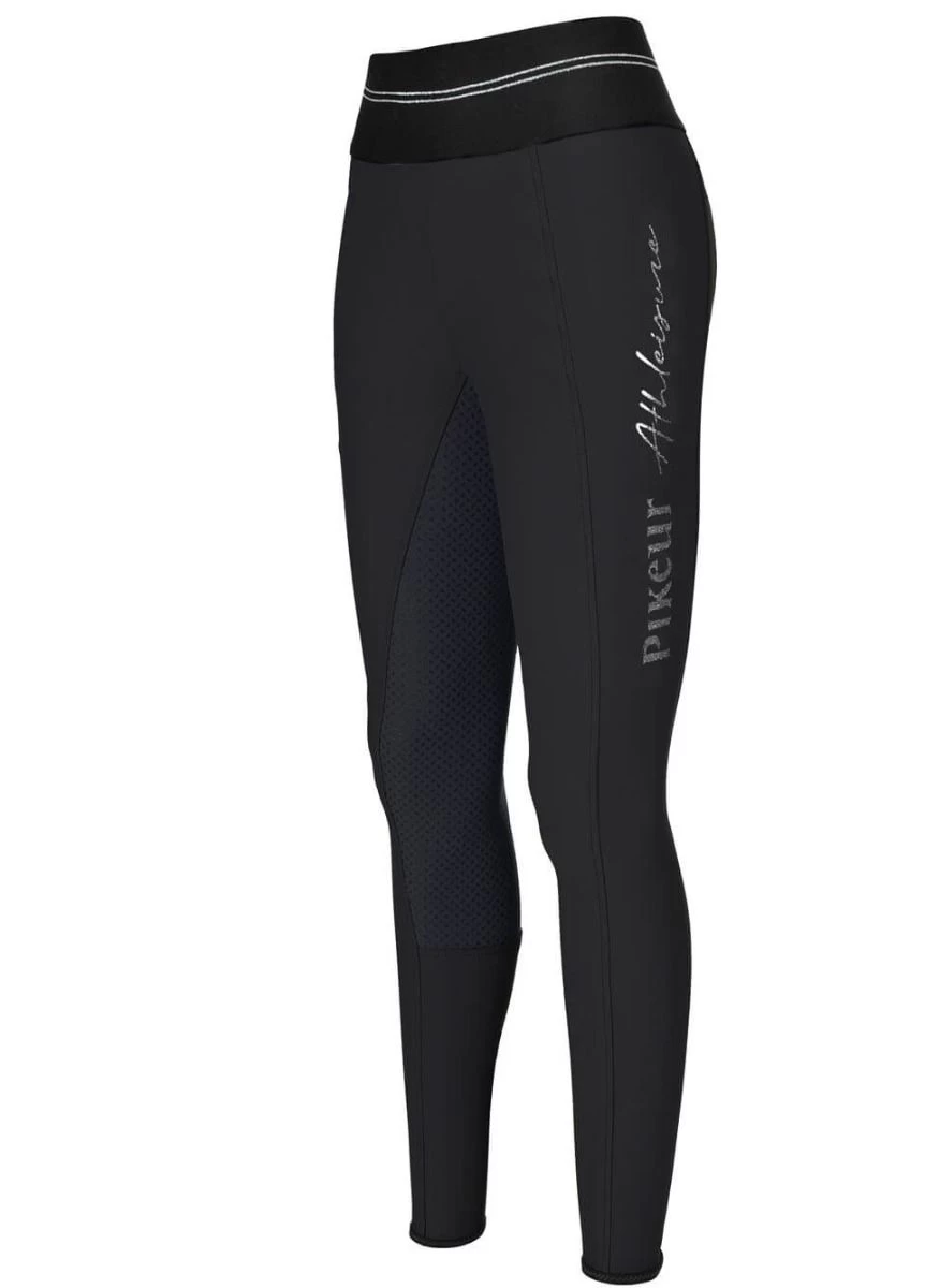 They additionally feature a wide elasticated waistband with luxury interwoven silver lurex stripes, and the words ‘Pikeur Athleisure’ embellished in silver down the left thigh.