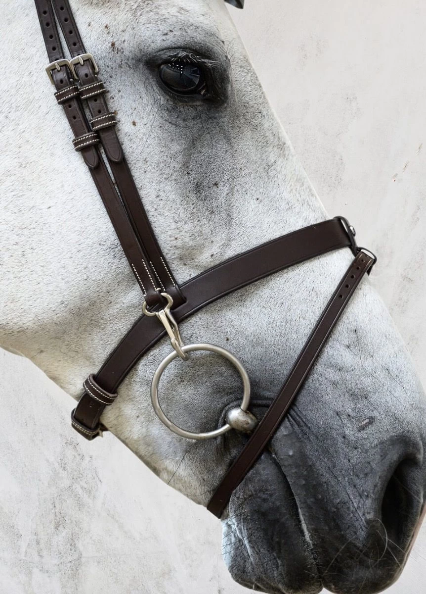 A stripped high function-bridle with a flat, simple noseband that has a completely removable flash strap discretely decorated with a PS badge. The hooks of which the bit attaches to have a transparent rubber cover in order to minimize the rattling that may occur between the metal. This is the perfect bridle for riders who often changes the bit since the simplicity of the hooks makes the bit-changing process very simple and efficient.