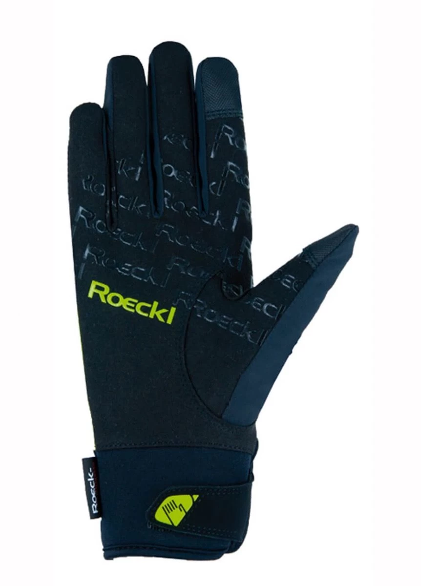 The waterproof WAREGEM glove offers ideal, pleasantly comfortable weather protection for cold, rainy days in the stables and on horseback. This narrowly cut riding glove fits like a second skin and features a PFC-free, highly breathable and elastic VaporFlex laminate on the backhand. The palm is made of durable DURADERO synthetic suede and boasts extensive siliconisation to ensure a non-slip grip on the reins. The model also features a permanently waterproof and breathable ROECK-TEX MEMBRANE, which stops the hands becoming chilled in very adverse weather conditions, and the soft, quick-drying and climate-regulating Easy-Dry lining for added warmth and comfort. Practical and functional: the layers of material on the palm have been elaborately glued together in order to prevent them from shifting when the reins are in action. The TOUCHSCREEN COMPATIBLE function on the thumb and index finger guarantees that the gloves can stay on during smartphone use. The easy closure fastener on the neoprene cuff ensures the WAREGEM glove encircles the wrist snugly and reliably. Furthermore, as riders appreciate the chance to maintain their sense of style when practising their favourite pastime, ROECKL has included metallic applications on the back of the hand.