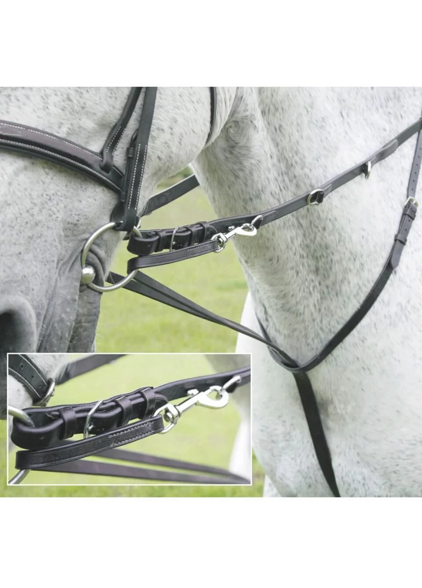 Velociti GARA market harborough in continental web and leather. Useful for ridden flat work. Pressure is applied to the bit when the horse raises his head too far, control of which is in the hands of the rider. Good for improving top line muscle. Stainless steel fittings.